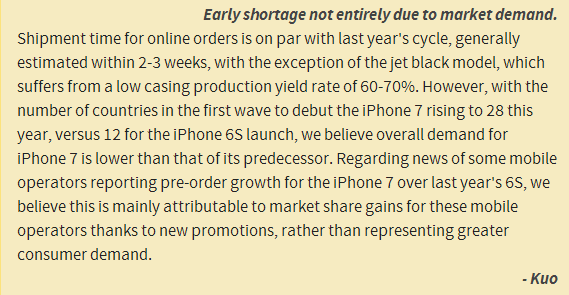 The manufacturing process for the jet black iPhone 7 is a little different from the process for other units and that has contributed to a global shortage of those devices. According to KGI analyst Ming-Chi Kuo, just 30-70% of jet black iPhones pass Apple's inspection, meaning the rest need to be reworked.