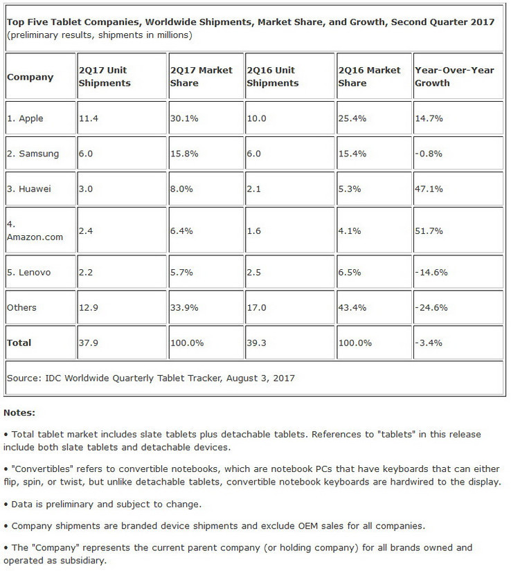 According to figures posted by IDC, top four tablet manufacturers, including Amazon, Apple, Huawei and Samsung, have shipped more tablets than during the same quarter last year, and have more market share. The only top tier company that failed to achieve better results is Lenovo.
