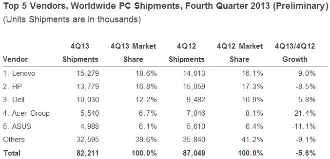 Dell saw growth rise to 5.8% in 4Q13 compared to the previous year. The Americas continued to be a strong area for Dell, while shipments in Asia/Pacific also returned to positive growth. |
